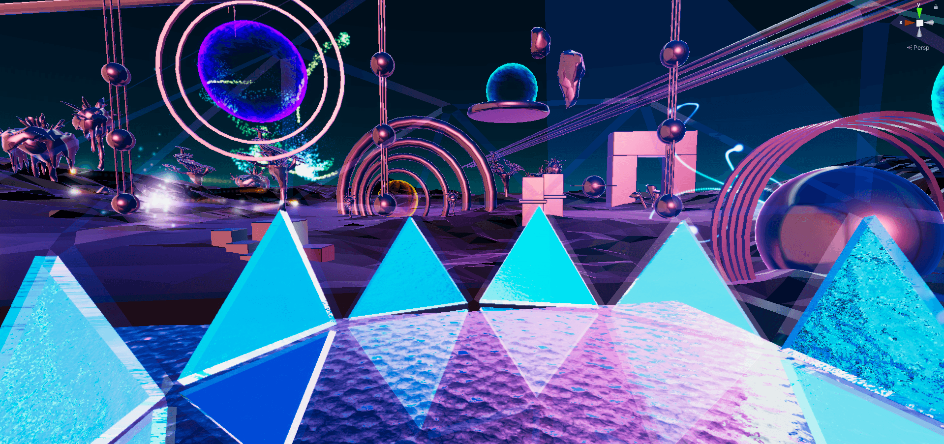 In this instrument, which we prepared by collabration with Tildestudio, the musician opens his eyes in VR inside a dome consisting of triangular modules. In this instrument, which has 2 rows of triangles, each triangle module corresponds to a note. An alternate reality planet was created for the stage design of this instrument. The components in the environment where you hit each note are triggered and the musician has the chance to distort the universe.
